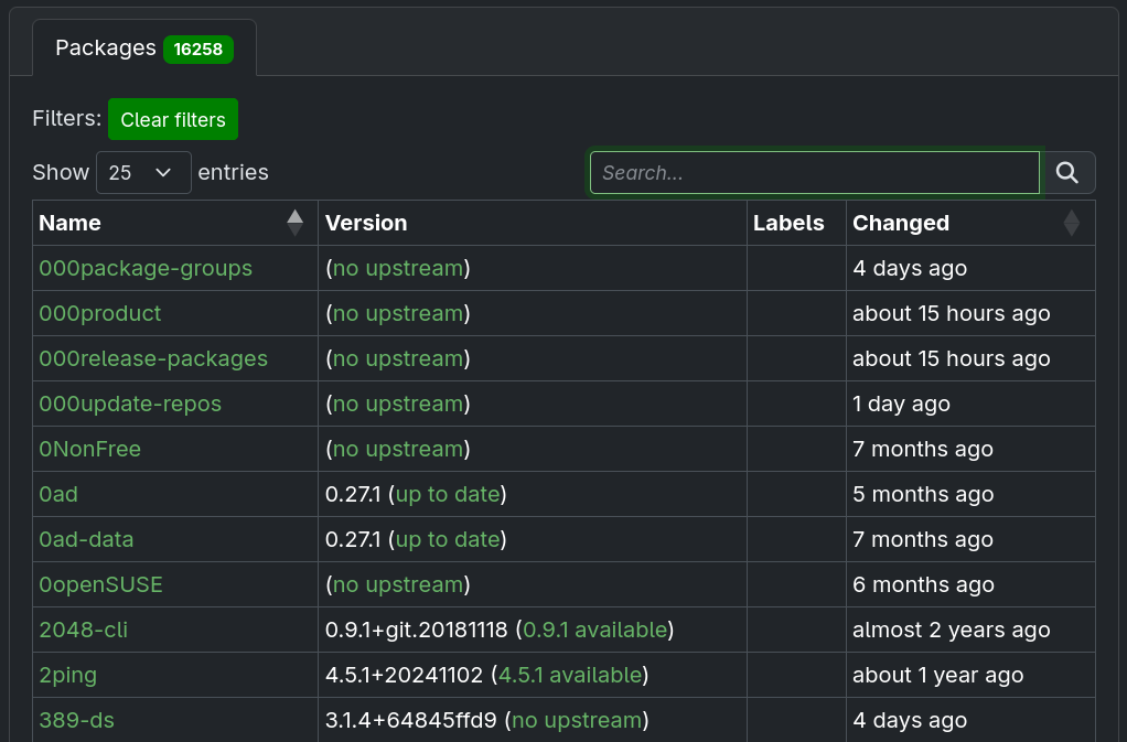 In some cases, you may want to get an overview of the packages that are in a specific version state. In such cases, searching by the strings visible in the Version column (i.e. no upstream or up to date) is possible.